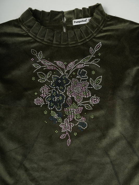 Pampolina Olive Sharing Top with Rhinestone Floral Design
