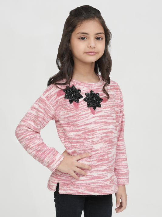 Pampolina Pink and White Fuzzy Striped Sweater with Flower Embellishments