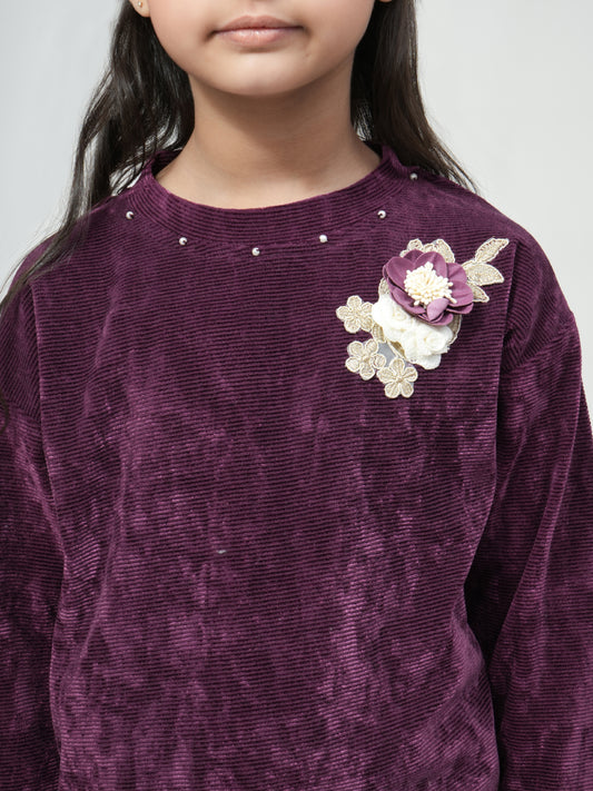 Pampolina Girls' Burgundy Knit Code Set - Top with Flower & Pants