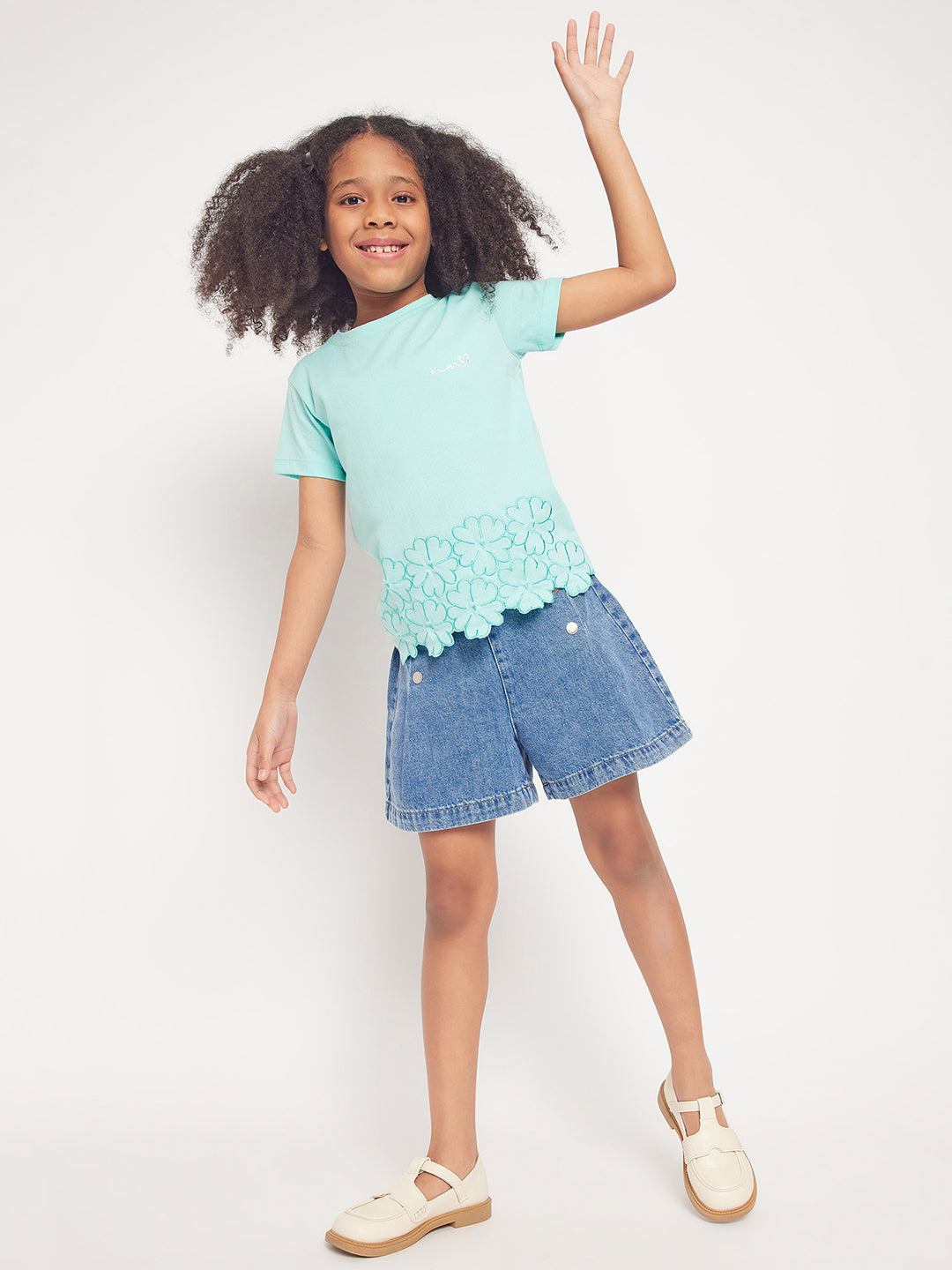 Pampolina Girls' C.Green Embordering Printed Top is made with soft cotton and a mix of polyster for a playful and comfortable fit. With a fun printed pattern, this top adds a touch of quirky charm to any outfit. Perfect for the fun-loving and stylish girl in your life. Made in India and featuring a half sleeve and round neckline, this top is a must-have for any little fashionista! HSNCode: 61112000.