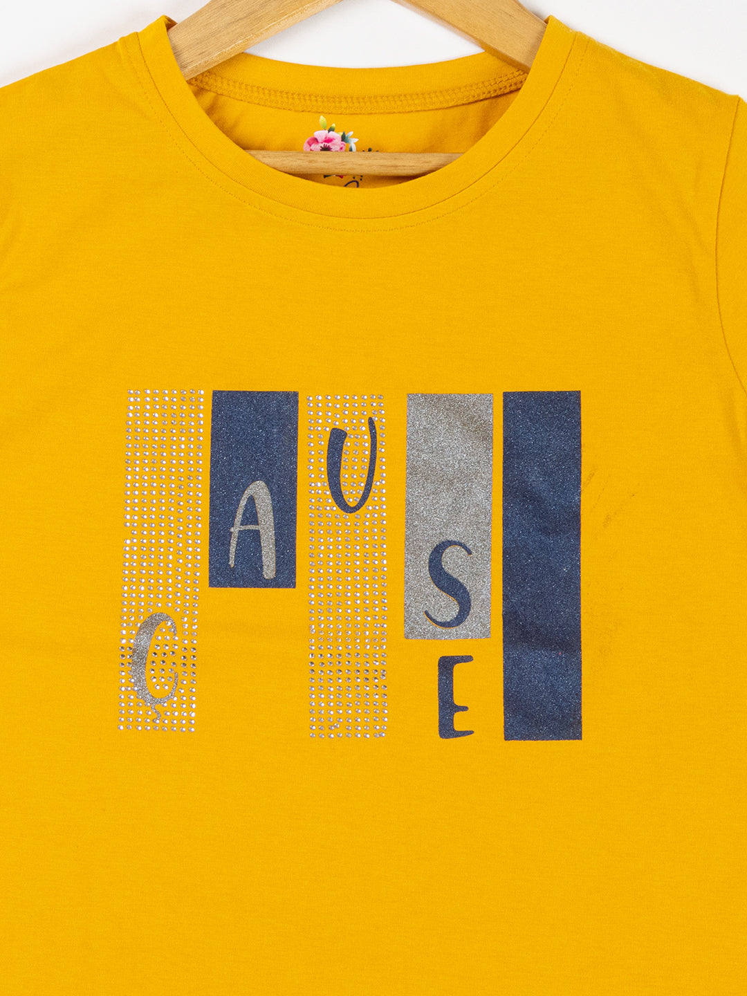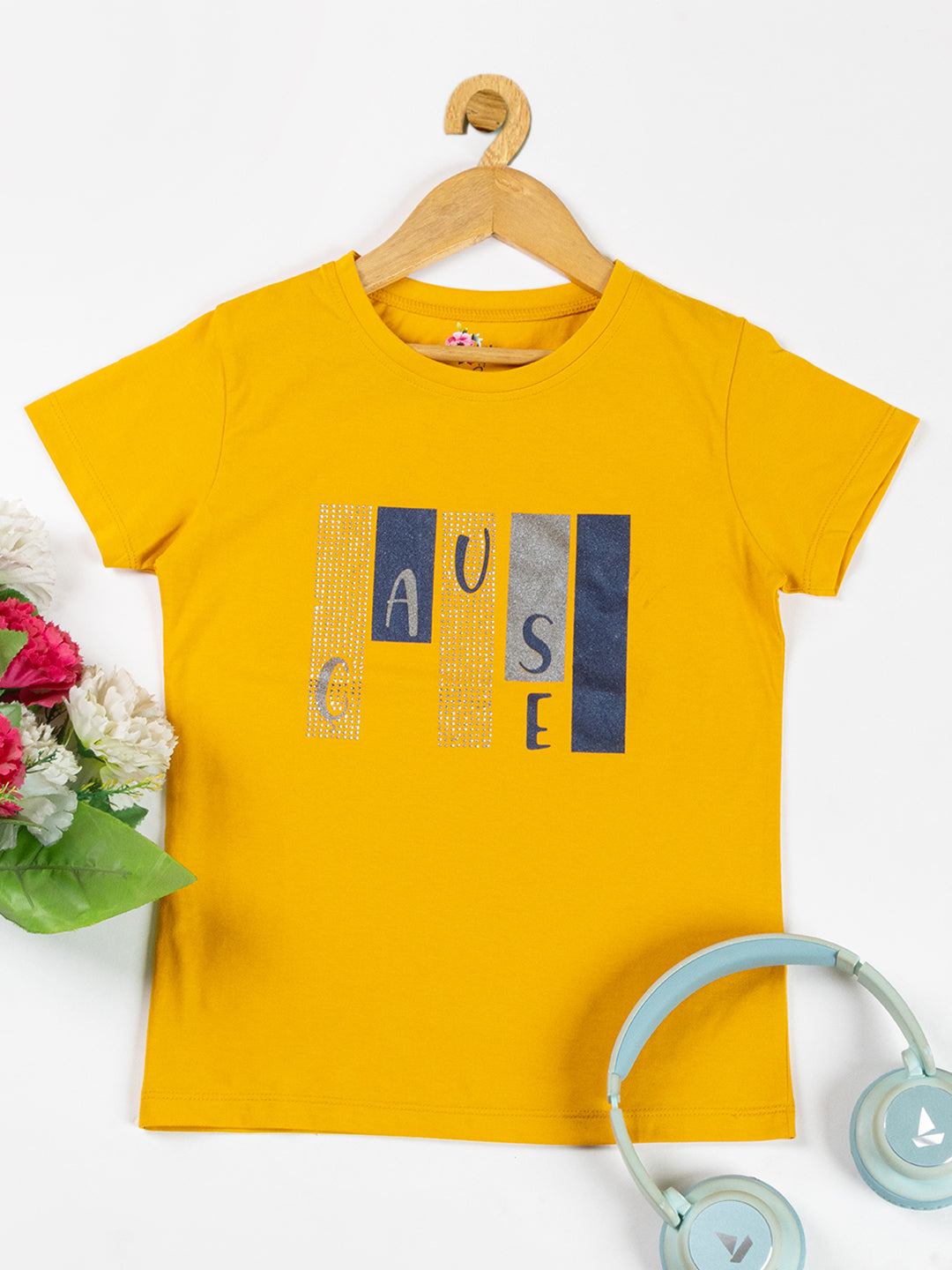 Introducing the Pampolina Girls' Sequin Printed Top in a vibrant mustard hue! Made of a blend of polyester and cotton, this knit top features a playful printed design perfect for any quirky fashionista. With a round neckline and half sleeves, it's the perfect addition to your little one's wardrobe. Made in India and suitable for females, this top is sure to make a statement. HSNCode:61112000.